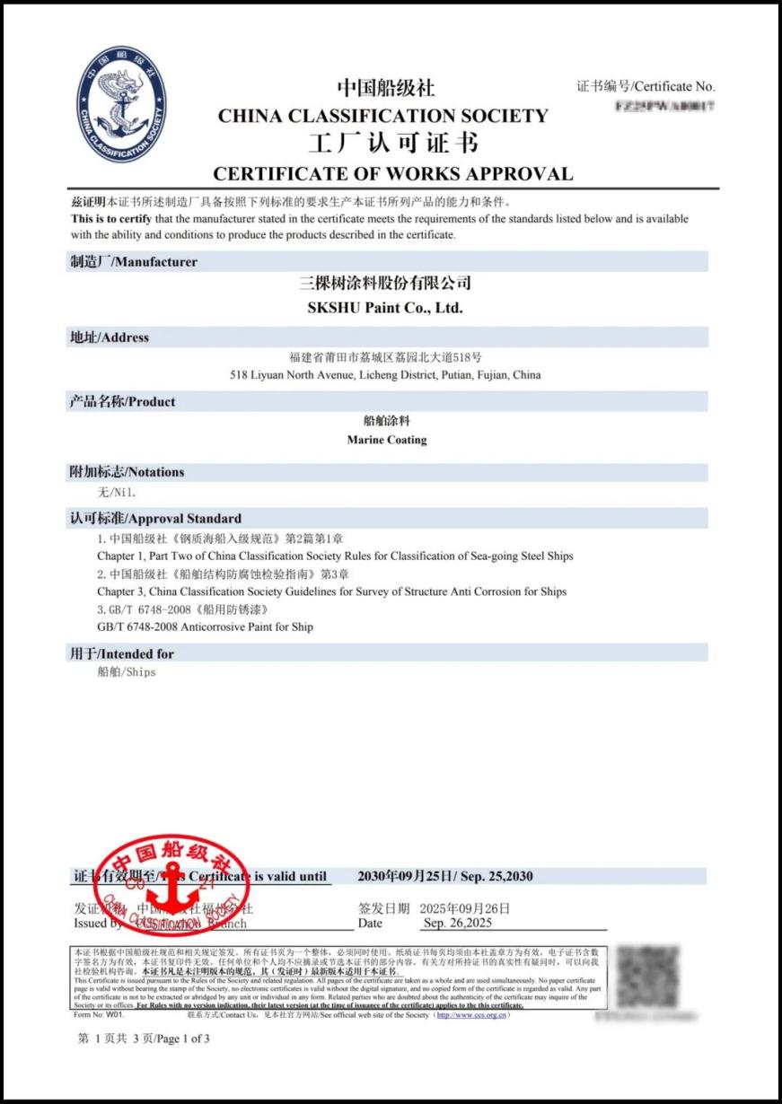 日前,三棵树得到中邦船级社(CCS)宣布的《工场承认证书》,这标识着三棵树正式进军船舶涂料墟市,得到了供职环球船舶与海洋设备的巨擘天资,正在高端工业涂料范围的征程上迈出了坚实一步。